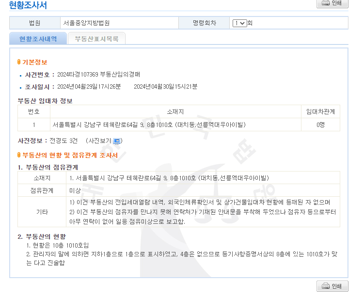 1. 경매 대상 아파트가. 주소 : 서울시 강남구 테헤란로 64길 9, 8층 1010호나. 사건번호 : 2024 타경 107369다. 면적 : 전용면적 28.34 제곱미터 2. 감정가 및 최저 입찰 금액가. 감정가 : 2억 6천6백만 원나